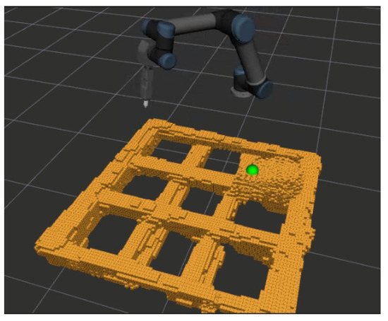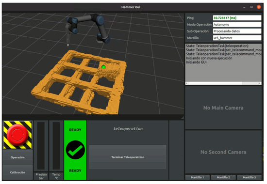 The user interface is used to provide the operator with multiple perspectives of the grid material. Here the operator can move the point cloud presented to him, and adjust the view to their liking, in order to improve the perception of the objects within the hammer workspace. The visual output of this interface is in the form of a visualization of the point clouds, previously processed by the modules described above. Figure 13 shows the interface implemented in this project. The interface shows the model of the UR5 robot, which can be rotated as desired by the user of the interface, and the cloud of collision points (in yellow). This interface includes visual signals to inform the operator of the current operation conditions.