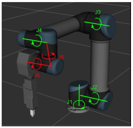 Articulated model of the adapted UR5. The green joints (J1, J2, J3, and J4) correspond to the articulated joints. The red (J5 and J6) correspond to the fixed joint of the kinematic model.