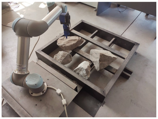 As a proof of concept, we built a realistic laboratory setup. The testing environment used for validation consists of a real, scaled grizzly with real rocks. The scales of both elements are in relation of 1:3. For the impact hammer, an UR5 robotic arm was used with a scale of 1:5, just as a real impact hammer. For having a similar kinematic model rather than a real rock breaker, two articulations of the UR5 were fixed, and the other four were tele-operated (see Figure 14). The UR5 robot was mounted, related to the grizzly, in the configuration used in a real mining operation. Figure 15 shows how the UR5 robot was installed for the experimental tests. Next to it, there is a metallic test grizzly to scale, with material (rocks) on it.