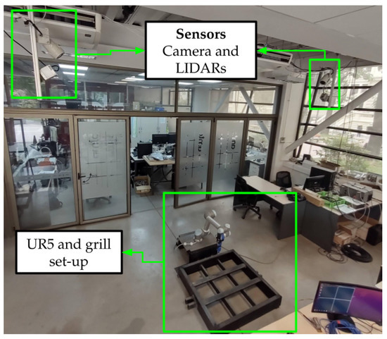 Two mounting-bases, each one containing a camera and a 3D LIDAR, are placed around the operation environment. This allows for the sensors to be located above the operational set-up, pointing to the grizzly and covering it completely (see Figure 16). In this work, Livox model MID-40 3D LIDARS and Arecont model AV5225 PMIR visible spectrum cameras are used.
