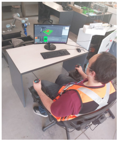 To test the haptic part, 2 Brunner CLS-E controls were used, which allowed up to four joints to be controlled simultaneously (each joystick has 2 degrees of freedom). For convenience, these were installed on a chair used for the tele-operation. Figure 17 shows an operator using the UR5 robot, the Brunner haptic controls (installed on a chair), and the user interface.