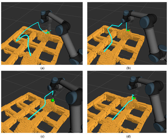Different hammer tip trajectory paths of task 2 (same operator). The path is on a cyan line. (a) Conf. A (user controls each joint of the arm). (b) Conf. B (user controls the pose of the end-effector). (c) Conf. C (user controls the pose of the end-effector and 3D reconstruction of the environment) (d) Conf. D (user controls the pose of the end-effector, 3D reconstruction of the environment, and haptic feedback).
