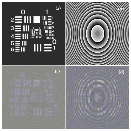 In the simulation setup in Figure 2, there are 1690 × 1690 pixels with 5 µm × 5 µm size on the CCD working chip and the recording distance is set as z = 79.4173 mm (all the parameters used satisfy the requirement of the sampling theory to avoid aliasing problem [4]). The holograms are computer generated by interference of three waves as Equation (4). Holograms from the three waves interference with AO1 = 0.1 Ar and AO1 = 0.5 Ar are shown in Figure 3c,d, respectively, where we can see that there are not only the hologram but also the fringes of the two plane wave interference. The straight fine stripes in Figure 3d are more obvious than that in Figure 3c because of the strong interference between the two plane waves. In fact, there are two sets of holograms in either Figure 3c or Figure 3d—on-axis hologram and off-axis hologram. The off-axis hologram contributes the information to the object wave; however, the on-axis part contributes only to zero order term and can be removed by spatial frequency filtering.