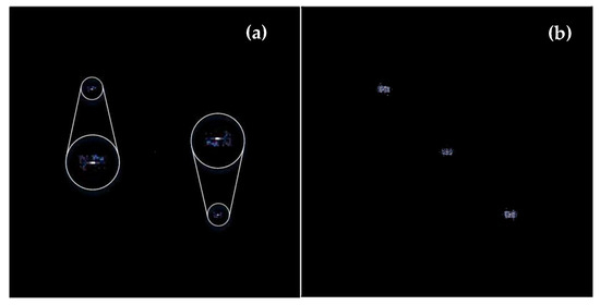 The intensity distributions of the spectra from hologram I for simulation. (a) two points δ(u ± up, v ± vp); (b) spectra areas.