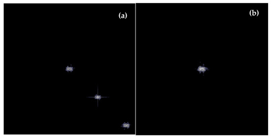 Step 1: Perform FT operations on the hologram I in Equation (5) and detect the spatial frequency points corresponding to the fourth term on the right side of Equation (6) by searching for the brightest points in the Fourier frequency plane (exclude the direct current point at the coordinate origin).