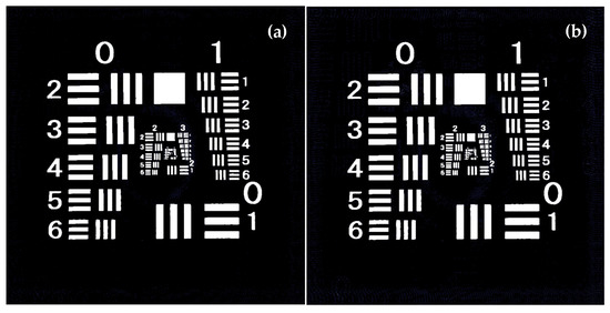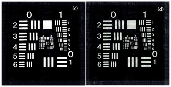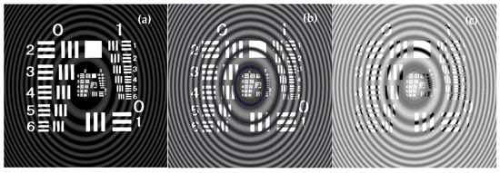 Wave front O is retrieved by using Equation (9) and the reference R with the tilt angles of about θx = 0.023 rad and θy = 0.023 rad. Then, the object image can be displayed after the inverse Fresnel diffraction is performed. It should be noted that, in the spectrum lobe kept at the center of the frequency plane, there still exists one delta function of δ(u, v) in Figure 5b. These spectra come from the fourth term of Equation (6) and always add unwanted effects on the hologram display. The larger the AO1, there is the more serious bad effect on the image display. To investigate the bad effect of them, three cases with AO1 = 0.1 Ar, AO1 = 0.3 Ar, and AO1 = 0.5 Ar are introduced in our investigation. The display results are described in Figure 6a–c, respectively. Naturally, when AO1 = 0.1Ar is used in Figure 6a, the impact of the δ(u, v) spectra is little and the transparent area in resolution target image is acceptable. However, for the cases of AO1 = 0.3 Ar, AO1 = 0.5 Ar, and other cases with even larger AO1, the bad impacts are serious and the displayed image in Figure 6b,c are unacceptable. To eliminate the negative impact, these spectra of δ(u, v) in Figure 5b are filtered out by improving the window function.