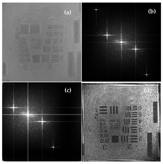 One of the recorded holograms is shown in Figure 9a where there are many regular fine stripes. FT operation is carried out in Figure 9a, and the spectra distribution is given in Figure 9b. Five bright areas in Figure 9b are negative second order spectra, negative first order spectra, zero order spectra, positive first order spectra, and positive second order spectra from the top corner left to lower right corner consequently. The coordinates of the center of the positive first order spectra are found as up = 184 pixel and vp = 89 pixel. Then, the reference tilt angles are calculated by using Equation (7), and the results are about θx = 0.015 rad and θy = 0.007 rad. Reference wave is reconstructed by Equation (8), and another FT operation is carried out by Equation (9) with the spectra distribution in Figure 9c. The whole spectra are shifted in Figure 9c after using the tilt reference wave so that the positive first order spectra are moved to the center of the spectrum plane. After choosing the positive first order spectra, the recovered image is achieved and shown in Figure 9d. The reconstructed image occupied the full field of view without the disturbances of the twin image and zero order term. The fact that the image recovered is displayed at the center of Figure 9d without any human operation shows the locating accuracy of the method here.