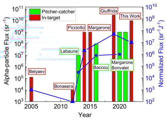 The experimental progress in p–B fusion, measured in terms of α-particle production in the “in-target” [2,3,4,7,14] and “pitcher–catcher” [5,6,8,15] geometries. The left-hand scale indicates the absolute α-particle flux (particles/sr), while the right-hand scale is normalized to the laser energy delivered on target (particles/sr/J).