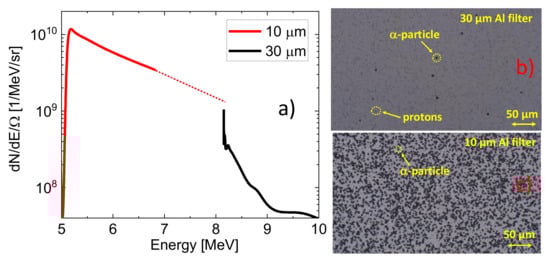 (a) The experimental spectrum of the α-particles that were emitted in the backward direction from the target’s front surface; (b) the corresponding CR39 raw image in the case of the 30-μm Al filter and (c) the 10-μm Al filter.