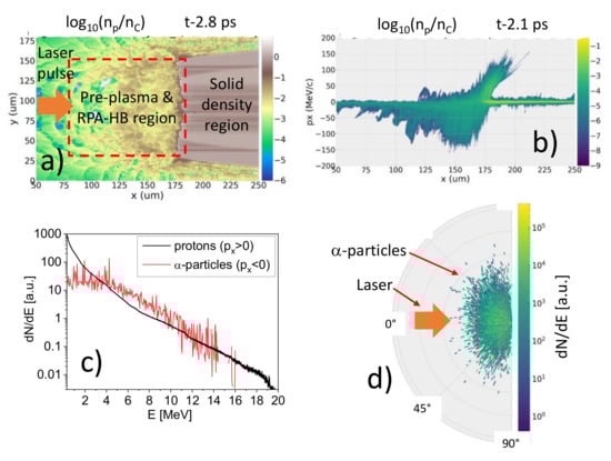 (a) The proton density map that was calculated by 2D PIC simulations at t = 2.8 ps (i.e., 1.2 ps after the highest intensity peak entered the highest density part of the target); (b) the proton phase space plot at t = 2.1 ps (the proton density is shown in units of plasma critical density); (c) the proton energy distribution (px > 0) and α-particle energy distribution at the target’s front side from PIC and Monte Carlo simulations, respectively; and (d) the α-particle angular distribution from the same simulation run.