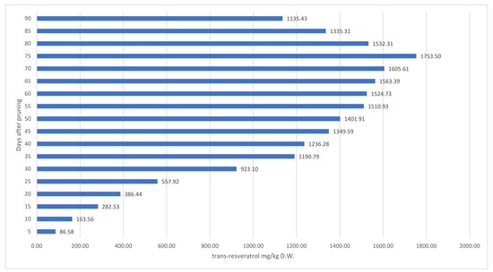 Day 1 of the analysis was when the vine waste was collected from the vineyard; the first sample was dried and then extracted with an ethanol–diethyl ether mixture. The minimum value of trans-resveratrol content in vine shoots was registered on day one of the analysis (14.93 mg/kg D.W.) and the maximum value was registered on day 70 of the analysis (2712.86 mg/kg D.W.).