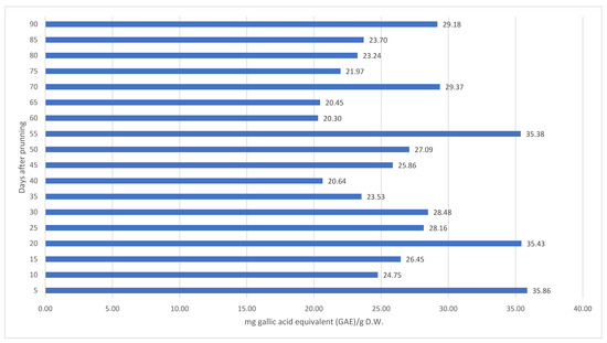 Total phenolic content of the vine shoots was estimated using the Folin–Ciocalteu colorimetric method. The mean values calculated for 5 days in a row for TPC of vine shoots samples analyzed for 90 days are displayed in Table 2. As seen in Figure 2, the total phenolic content (TPC) values remained constant, between a 20 and 30 mg gallic acid equivalent (GAE)/g D.W., except for 5 days when higher values were recorded. The highest value was recorded on day 54 (82.42 mg GAE/g D.W.), and the lowest on day 57 (14.61 mg GAE/g D.W). Total polyphenol content remained constant, which could be attributed to polyphenols, other than trans-resveratrol, whose content may increase, decrease, or remain constant during the 90 days (piceatannol [14,17], apigenin, ellagic acid [30], viniferin, trans-vitisin, trans-piceid [31], gallic acid, ellagic acid, p-coumaric acid and others [32].