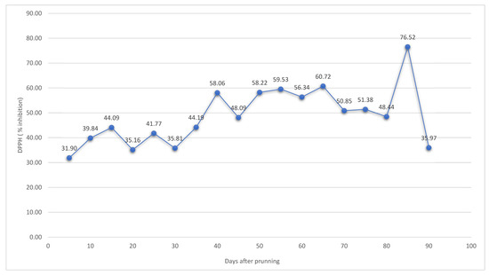 DPPH % inhibition in vine shoots during the 90-day post-pruning time storage.