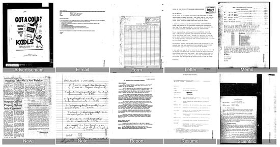- Harley, A.W.; Ufkes, A.; Derpanis, K.G. Evaluation of deep convolutional nets for document image classification and retrieval. In Proceedings of the 2015 13th International Conference on Document Analysis and Recognition (ICDAR), Tunis, Tunisia, 23–26 August 2015; IEEE: Piscataway, NJ, USA, 2015; pp. 991–995. [Google Scholar]