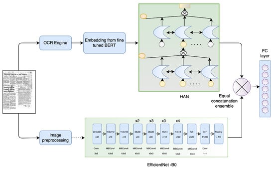 The figure depicts the overall architecture of the network. As we can see, the document image is split into two streams. The textual stream consists of an OCR engine, fine-tuned BERT, and the HAN model in series. The visual stream is composed of a preprocessing layer and an EfficientNet model. The features from both streams are then assembled with equal concatenation and finally passed on to the fully connected layers with softmax to classify against ten classes of the Tobacco-3482 dataset.