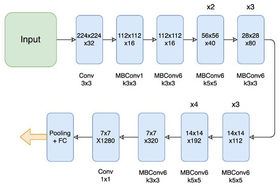 The architecture of EfficientNet [21]. As we can see, it consists of only fewer layers and lesser parameters. The ‘x’ marks on the top indicate the number of such layers present.