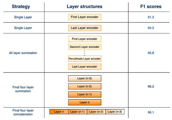 This Figure depicts different strategies for obtaining better embedding for our problem. Each layer in the figure corresponds to the layer of the BERT-Base, which consists of 12 layers of transformer encoders.