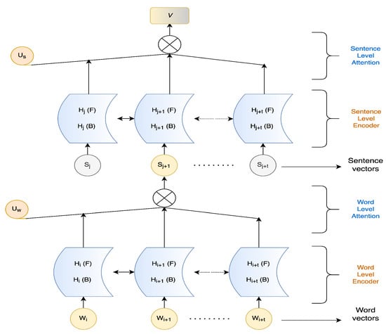 - Yang, Z.; Yang, D.; Dyer, C.; He, X.; Smola, A.; Hovy, E. Hierarchical Attention Networks for Document Classification. In Proceedings of the 2016 Conference of the North American Chapter of the Association for Computational Linguistics: Human Language Technologies, San Diego, CA, USA, 12–17 June 2016; Association for Computational Linguistics: San Diego, CA, USA, 2016; pp. 1480–1489. [Google Scholar] [CrossRef] [Green Version]