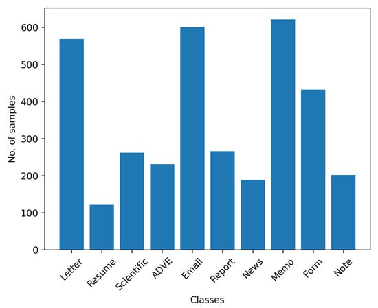 This figure shows the overall distribution of samples across all the classes in the Tobacco-3482 dataset.