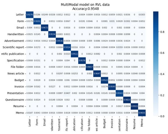 The figure depicts the confusion matrix of the model on RVL-CDIP test data.