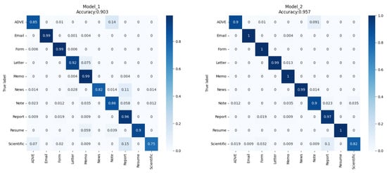 These are the confusion matrixes for the models from two different experiments carried out in this paper. The Model_1 matrix on the left is a model without RVL-CDIP pretraining, instead directly trained and tested on the Tobacco-3482 dataset. The Model_2 matrix on the right is a model trained on RVL-CDIP prior and then trained and tested on the Tobacco-3482 dataset. The visual stream in both methods uses pre-trained ImageNet weights in this model.