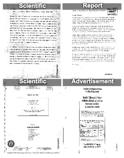 Overall, for both the models, we can see that the class Scientific is poorly classified. A careful study on this has been done on why and when the classifier fails. It is observed that the classifier failed to identify properly the class Scientific, but no other classes were mixed up with Scientific. During analysis, we found that there are only a few defining features for the class Scientific. It mostly resembles another class, Report, with clear-cut features in both textual and visual streams. As we can see in Figure 13 the image from Scientific is very much similar to the one from Report. It is both visually and textually impossible to make a clear decision. Since the features for Report are fixed because of its discipline, even the scientific is confused with being a Report in this case. Furthermore, another class Advertisement resembles some of the images of class Scientific. The samples are depicted in Figure 13 for reference. In addition to overlapping features, another reason for poor performance in the Scientific class is the amount of noise in the images from this class. As we can see from Figure 8, the image (A), which belongs to the class Scientific, has so much noise that it has blurred the text. As a result, the OCR engine fails to extract the exact text, and thus even the textual stream, which is supposed to identify the class based on attention and contextual information fails to identify the image correctly. One future direction to improve the performance is to augment the data with synthetically generated images that can highlight the salient features.