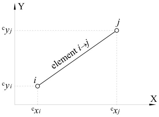 The basis of the truss superstructure is composed by n defined nodes, n∈N. Each alternative truss element is defined as an inter-connection between two nodes: for each pair of nodes i and j, where i∈I = {1,2,3,…n} and j∈J = {1,2,3,…n} and i < j, an element coefficient eli,j is defined. The coefficient eli,j is valued 1, if an alternative element (bar) exists connecting nodes i and j (in the following text denoted as i→j); otherwise, eli,j is equal to zero. An n × n truss element matrix EL is then formed from coefficients eli,j. The definition of a truss element and its position in the global coordinate system XY is shown in Figure 1.