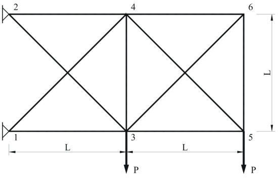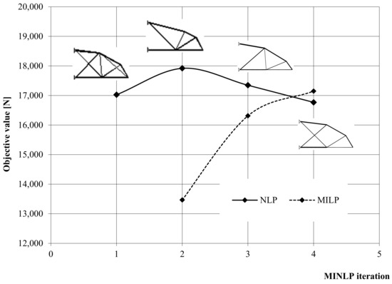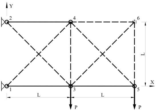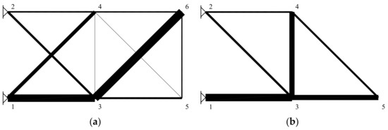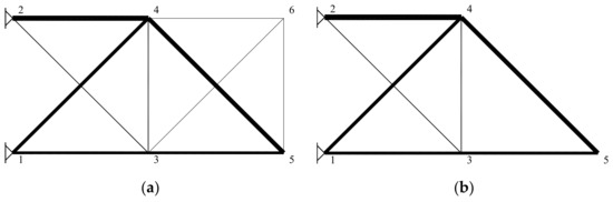 By including the deflection constraints and statically indeterminate solutions, the discussed truss problem becomes a non-linear one. Numerous topology optimization problems of trusses, solved by the non-linear programming (NLP) approach, were therefore subsequently presented [6,7,8,9,10,11]. Using continuous optimization methods, i.e., the LP or the NLP, the truss topology optimizations were performed by either allowing zero values or by defining a small lower bound of the cross-section areas of bars. While the former approach caused problems to be potentially insoluble due to the possible appearance of singularities, the latter generally lead to non-exact solutions, which require reanalysis. Moreover, allowing zero or non-zero values led to non-convexities, which usually cause the optimization to become stuck in poor local optima.