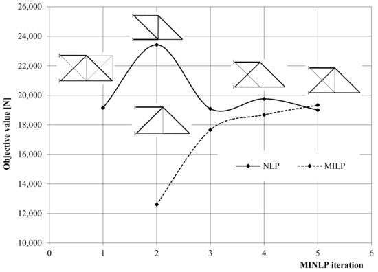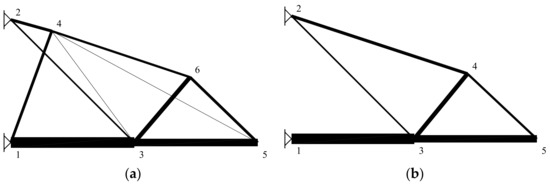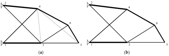 The purpose of the logical constraints (Equations (18)–(24)) is defining different discrete decisions related to reducing the set of topology alternatives, defining the inter-connections between structural elements, establishing the bounds on continuous variables for alternative elements and linking the continuous sizing variables with discrete/standard values. It should be noted that all the logical constraints are expressed by the use of binary variables.