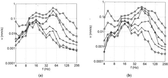 Train induced ground vibration, (a) at site N, (b) at site H, at distances x = □ 3, ○ 5, ∆ 10, + 20, × 30, and ◊ 50 m [20].