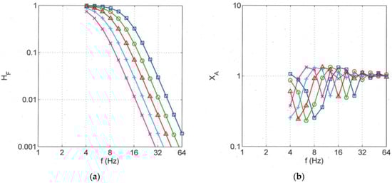 where J0 is the Bessel function. The transfer function HS(ω,r) of the wave propagation through a layered soil can be approximated by the transfer function HH(ω,r,vS) of the homogeneous soil and the frequency-dependent wave velocity vS(ω) (the dispersion of the soil) [40]. Figure A1 shows the good agreement between the exact and approximate transfer functions for the wave propagation in a soft layer on a stiffer half-space.