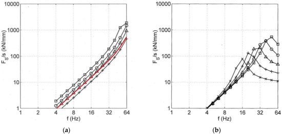 First, the most important vehicle–track–soil transfer function FS/s = HT HV is presented for the variation of some vehicle and track parameters. The vehicle–track–soil transfer function is strongly influenced by the unsprung mass of the vehicle, the wheelset mass (Figure 4a). The dynamic axle loads are proportional to the wheelset mass for frequencies up to 64 Hz. For this frequency range, the transfer function increases strongly with FS/s ~ f2. If soft under-sleeper pads are added to the track (Figure 4b), resonances can be seen at frequencies between 16 and 64 Hz. Above these resonance frequencies, the dynamic axle-loads can be reduced to less than one-tenth of the values of a standard ballast track. Vehicle–track resonances, however, do not occur for the standard ballast track in the frequency range of interest.