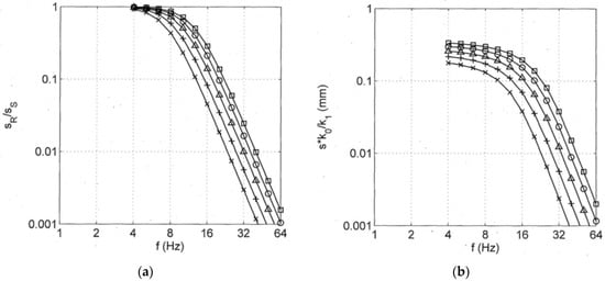 The stiffness variation is assumed to be constant at k1/k0 = 20%, and the stiffness variation by the sleeper passage is included as an effective irregularity of sD = 0.012 mm. The resulting effective irregularity at rail level is shown in Figure 8e. For the train speed of 100 km/h (curve ∆), the following components can be observed. At low frequencies, the geometric track support irregularities dominate, but also strongly decrease with sR ~ f−2. The transfer function HsT for the geometrical track support irregularity has a cut-off at about 8 Hz and, therefore, the effective irregularity s* from the support stiffness variation dominates at about 12 Hz. This component is initially constant with frequency and the cut-off of the corresponding transfer function HkT is at about 20 Hz, from where the stiffness component also decreases until the wheel and track unevenness sW is dominant at 25 Hz.