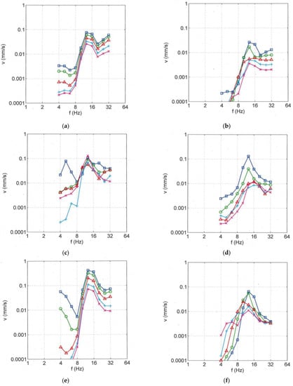 Next, the train was run over an irregular track support and the ground vibration spectra are shown in Figure 6d–f. Once again, the passage of static loads generates the quasi-static response of the soil. The typical spectra can be observed below 8 Hz. For frequencies above 8 Hz, a big difference between the regular and irregular track support is obvious. Whereas the quasi-static component tends to zero, the varying track support stiffness generates a new ground vibration component with considerable amplitudes. The low-frequency quasi-static and the mid-frequency response are clearly separated by a minimum at around 8 Hz. There is a second minimum at 25 or 32 Hz, so that the mid-frequency ground vibration component can be identified by a typical maximum region between these minima. This characteristic is related to the axle-sequence spectrum XA(f) of a bogie. The mid-frequency component also has a completely different attenuation with distance. In contrast to the strong attenuation of the quasi-static component, the mid-frequency part has a rather weak attenuation.
