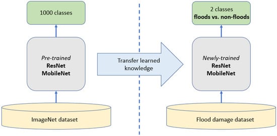 The transfer learning workflow for binary classification into floods and non-floods by using pre-trained ResNet and MobileNet.