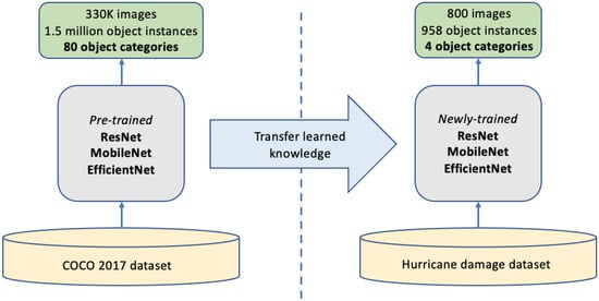 Figure 2 shows the object detection workflow for training ResNet, MobileNet, and EfficientNet. All three networks were pre-trained on the same image resolutions (640 × 640 pixels) and the COCO 2017 dataset [30] which contains 330,000 images and 80 object categories. Each of the three models were also configurable to begin with the same training parameters. Therefore, the batch size was set to four images, and each model training instance was terminated after the twenty-thousandth epoch. Our damage detection dataset was configured with a 50/50 split for training and testing purposes when pre-processed into each of our models. This left 400 images and their corresponding annotations for model training and the other 400 images and their corresponding annotations for testing each of the models’ predictions. Our transfer learning work leverages the pre-trained model weights for features extracted from the typical objects contained within the COCO 2017 dataset. More specifically, our hurricane damage detection transfer learning work consists of the following steps.