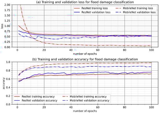 The training and validation cross-entropy loss and accuracy for the flood damage classification using ResNet and MobileNet.