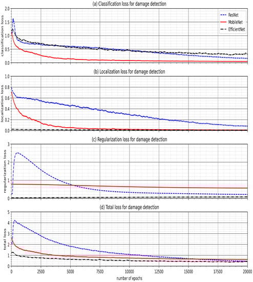 Figure 4 shows the training metrics for hurricane damage detection which utilize the cross-entropy, MSE, L1, and L2 loss functions in Equations (1), (7) and (8). Figure 4a shows that EfficientNet converges to an approximate value of 0.3, ResNet converges to an approximate value of 0.18, and MobileNet converge to the lowest value of training classification loss at approximately 0.05. All three models achieve values for classification loss ≤ 0.3, which is generally accepted for concluding model training. However, ResNet experiences a sharp spike in classification loss between 0 and 500 epochs. This can be attributed to the early point in the training process where there has not been a significant relation of extracted features within the model’s network to image features for the four classes in our model.