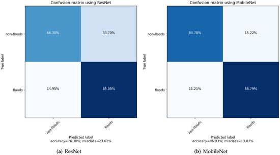 Model classification performance is further evaluated by using precision, recall, and F1 score, as defined in Equations (3)–(5), respectively. The result is summarized in Table 3. The precision metric measures the accuracy of the true positive predictions (i.e., floods label) by dividing the true positive predictions over the sum of true positive and false positive predictions. The precision values for ResNet and MobileNet are 0.75 and 0.87, respectively. This indicates that MobileNet shows a higher accuracy (about 12%) than ResNet in terms of floods image classification. The second metric recall measures the true positive rate (i.e., the ratio of floods images that are correctly detected by the classifiers. The result shows that the recall of MobileNet is about 4% higher than that of ResNet. The last metric examined in this study is the F1 score, which is the harmonic mean of precision and recall, as defined in Equation (5). As a result, the classifier only obtains a high F1 score if both precision and recall are high. The F1 score result shows that MobileNet obtains a F1 score that is about 9% higher than that obtained by the ResNet-based classifier. In short, both the confusion matrix comparison in Figure 5 and metric comparison in Table 3 show that the flood damage classification models developed through transfer learning are accurate. Furthermore, the classifier using MobileNet as the base model performs better than a transfer learning model developed on the basis of ResNet.