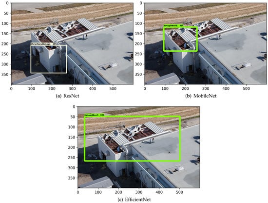 In Table 4, the top predictions for MobileNet and EfficientNet correctly classify the object as a damaged roof, and MobileNet achieves the higher confidence score of 90.93% for that predicted class. The bounding box location in Figure 6c predicted by EfficientNet more accurately encompasses the entire damaged roof structure in comparison to the bounding box location in Figure 6b predicted by MobileNet. On the other hand, the top two predictions made by ResNet are inaccurately classified as structural damage, and the bounding box location in Figure 6a is also inaccurate due to the different image features associated with the structural damage class. The same applies to the third prediction made by ResNet of the flood damage class and the third prediction made by EfficientNet of the structural damage class.