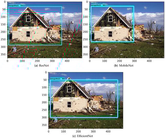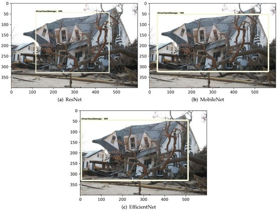 In Table 7, the top predictions for ResNet, MobileNet, and EfficientNet correctly classify the object as structural damage, and MobileNet actually achieves the lowest confidence score of 42.85% for that predicted class. ResNet and EfficientNet achieve similar confidence scores of 68.11% and 67.96%, respectively, for their top prediction. Although the bounding box location in Figure 9b predicted by MobileNet more accurately encompasses the entire structural damage area in comparison to the bounding box location in Figure 9a predicted by ResNet and Figure 9c predicted by EfficientNet, the second and third predictions made by ResNet and MobileNet are inaccurately classified as either a damaged wall or a damaged roof, very likely due to the similar features of structural damage in this image that the model has learned to extract in predicting the damaged roof and damaged wall classes as well. The same applies to the third prediction made by EfficientNet of the flood damage class.