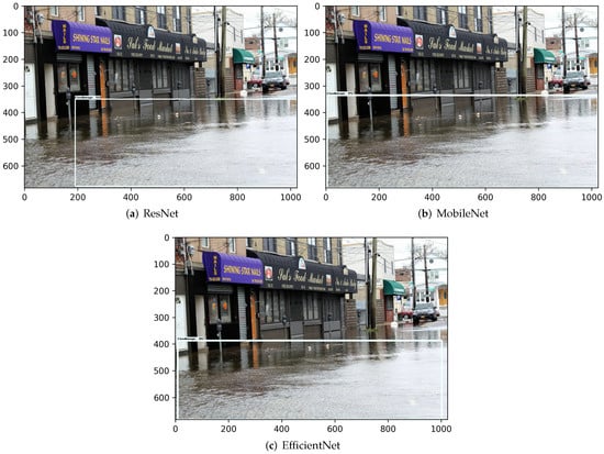 In Table 6, the top predictions for ResNet, MobileNet, and EfficientNet correctly classify the object as flood damage, and MobileNet again achieves the highest confidence score of 97.45% for that predicted class. The bounding box location in Figure 8b predicted by MobileNet more accurately encompasses the entire flood damage area in comparison to the bounding box location in Figure 8a predicted by ResNet and Figure 8c predicted by EfficientNet. However, the second and third predictions made by ResNet and MobileNet are inaccurately classified as either a damaged wall or a damaged roof, likely due to some features of the building in the background of the image that would be extracted to predict those classes. The same applies to the second prediction made by EfficientNet of the structural damage class.