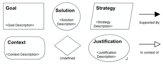 GSN is a standard used to represent assurance cases graphically [15]. Figure 1 illustrates the main components of GSN: Goal (rectangle), Solution (circle), Strategy (parallelogram), Context (rectangle with rounded edges), Justification (ellipse), Undefined (diamond), SupportedBy, and InContextOf. The SupportedBy and InContextOf components are used to connect goals to solutions and perform context associations, respectively. Goals are useful to provide claims about systems quality, while solutions are linked to evidence of such a claim. Strategy, Context, and Justification are complementary components to improve the clarity and completeness of the assurance case specification. The Undefined component provides a way to illustrate parts of the assurance case that are still under specification.