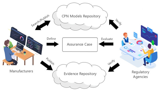 Figure 3 illustrates the relationship between manufacturer and regulatory agency using the . The manufacturer and regulator access two repositories: CPN Models Repository and Evidence Repository. They maintain CPN modules of reference models and evidence on the fly, respectively. Manufacturers search for existing system modules under development in the repository to access and compose modules, generating specific systems versions. When there is no reference model (or module) available that fits the system, it is necessary to generate a new model that may be published in the repository. The regulatory agency evaluates the ACES-based assurance cases by analyzing arguments with linked evidence (published in the repository). The regulator may verify the model of the system available on the fly.