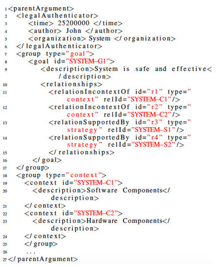 Considering that assurance cases contain a set of related arguments about quality attributes of a system (e.g., safety and efficacy), ACES represents them using the <parentArgument> and <childArgument> tags. The <parentArgument> tag composes the body of the <assuranceCase> tag and represents the main structure of the assurance case in modular GSN. In contrast, the <childArgument> tag represents structures that are parts of the body of the <parentArgument> tag. In this case, an ACES document only contains one <parentArgument> that may consist of multiple assurance case modules: child arguments relate to specific GSN modules. Each ACES argument contains the <legalAuthenticator> tag, aiming to record the author of modifications in the ACES document.