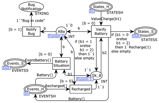 We divide the software module into three parts related to the steps of intermediate modular decomposition: battery verification, pump configuration, and insulin infusion. The battery verification starts from the Battery Situation transition (Figure 7), sending a message to the hardware to obtain the current status of the battery. The software receives a valued message from the hardware (ValueCharge(b1)) carrying the current status and verifies if the battery is charged enough to continue working. Otherwise, in addition to releasing the battery verification event, the software releases the battery recharge sending a Recharge(1) message to the Battery module. If there is more than one battery, the software sends the notification and continues working normally. The initial marking of the fusion place called Ok_B specifies the system contains only one battery. If there is more than one battery, the software can send a recharge message to a discharged battery and keep using the charged ones. When all batteries are discharged, the pump stops running, activated again after charging at least one battery. The initial marking of the fusion place Ok_B specifies that the system contains only one available battery.