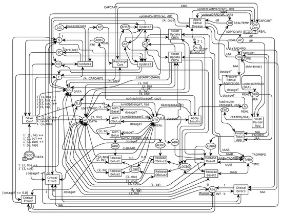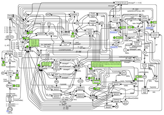 Three types of software failures are critical to the pump’s functioning due to risks to the safety of users: (i) failures that happen when the insulin dosages are being selected (no dosage has been selected), (ii) failures that happen when the insulin dosages are being selected (at least one has been selected), and (iii) failures that happen when insulin dosages are being applied. When failures occur, the system should stop running immediately, informing the user about the malfunctioning. The personalized insulin infusion mode behaves similarly to the standard mode; however, instead of the dosages’ constant values, the personalized mode allows the user to define the desired dosages from a text file. This mode applies list data structures to represent the insulin dosages. It converts them into original tuple format, removing the first basal dosage from the list called listBa to add the dosage in the head of the list called listDC. A place is responsible for recording the remaining basal dosages to be applied. The specification remains almost equal to the standard mode, where the most significant change regards the usage of the remaining basal dosages, repeating the infusion until there exist no tokens of basal dosages representing the remaining insulin. The specification of the process of recharging the cartridge is also almost equal to the standard mode, adding new places and transitions to control three situations: (i) the system applied the current basal dosage and it is necessary to apply the remaining; (ii) it is necessary to apply the current basal dosage and there are remaining dosages recorded; and (iii) there is no current basal dosage.
