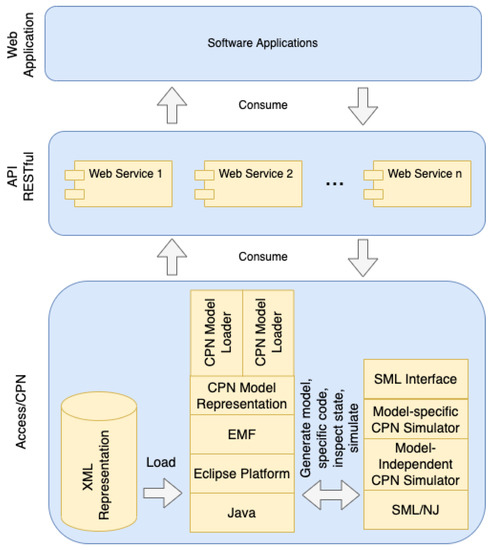 The CPN/Tools software is used to model, conduct simulations, and run CPN/ML codes. However, it is possible to handle CPN models without requiring the usage of a GUI. The Access/CPN framework enables users to handle model components, simulations, and CPN/ML code using the Java programming language [16]. For instance, such a framework provides methods to fire the enabled transitions and obtain tokens related to specific places. This type of functionality is relevant, for instance, to embed the CPN models in software applications for training modelers on how to re-use the .