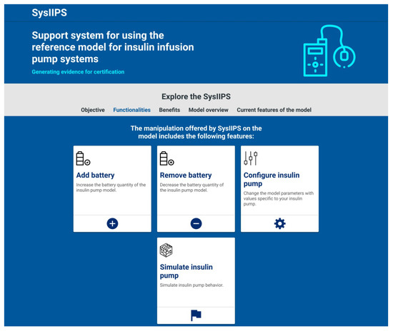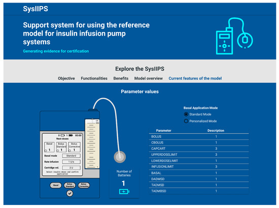 The modeler can use the web-based application to handle the CPN model of insulin infusion pump systems using four main features: (1) add a battery to the system; (2) remove a battery to the system; (3) configure the insulin infusion pump; and (4) simulate the insulin infusion pump. Features (1) and (2) allow the user to change the structure of the CPN model by adding/removing an instance of a module that represents the battery of the insulin infusion pump. Such changes are allowed due to the modularization capabilities of hierarchical CPN. Feature (3) allows modelers to change the values of the parameters of the reference model. Finally, Feature (4) allows modelers to simulate the CPN model using the GUI of the web-based application, without using CPN/Tools, to improve the understanding of the pump’s behavior without the user having access to the internal structure of the model.