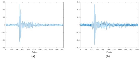 Because ultrasonic testing is usually performed in harsh environments, the possibility of the testing results being corrupted by electric noise, presented as white Gaussian noise (WGN), exists. Additive WGN was used to initiate this. The mathematical details of WGN are described in [12,13]. The WGN is added with two different signal-to-noise ratios (SNR) levels i.e., SNR 20 and SNR 15 (Figure 2). The number of testing signals increased threefold from 4386 to 13,158, including the original signal.